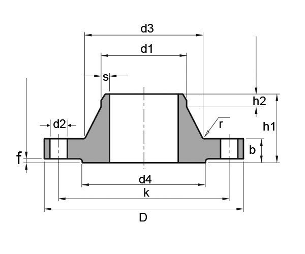 DIN 2630 PN2.5 Welding Neck Flange Dimensions, Technical Drawings, and Approx. Flange Weight DOWNLOAD DIN 2630 PN2.5 WELDING NECK FLANGE DIMENSIONS, TECHNICAL DRAWINGS, AND APPROX. FLANGE WEIGHT PDF Get Complete details of DIN Standard Flanges DIN 2630 PN2.5 Welding Neck Flange Dimensions Dimensions and Approx. Flange Weight Pipe Parameter d1 Flange Dimension Neck Size Hub Size Screw Approx. Flange Weight DN ISO DIN D b k h1 d3 s r h2 d4 f No. of Holes d2 KG/PCS 10 – 14 75 12 50 28 22 1.8 4 6 35 2 4 11 0.34 17.2 – 75 12 50 28 26 1.8 4 6 35 2 4 11 0.34 15 – 20 80 12 55 30 28 2 4 6 40 2 4 11 0.39 21.3 – 80 12 55 30 30 2 4 6 40 2 4 11 0.46 20 – 25 90 14 65 32 35 2.3 4 6 50 2 4 11 0.6 26.9 – 90 14 65 32 38 2.3 4 6 50 2 4 11 0.6 25 – 30 100 14 75 35 40 2.6 4 6 60 2 4 11 0.78 33.7 – 100 14 75 35 42 2.6 4 6 60 2 4 11 0.78 32 – 38 120 14 90 35 50 2.6 6 6 70 2 4 14 1.07 42.4 – 120 14 90 35 55 2.6 6 6 70 2 4 14 1.06 40 – 44.5 130 14 100 38 55 2.6 6 7 80 3 4 14 1.21 48.3 – 130 14 100 38 62 2.6 6 7 80 3 4 14 1.2 50 – 57 140 14 110 38 70 2.9 6 8 90 3 4 14 1.37 60.3 – 140 14 110 38 74 2.9 6 8 90 3 4 14 1.36 65 76.1 – 160 14…